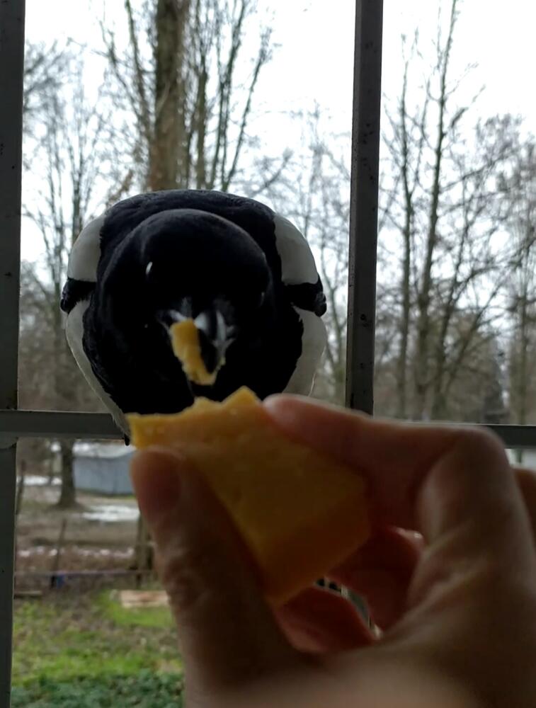 Замечу, что у сороки на фото хвостовое оперение неважное. Возможно, птица потеряла несколько перьев во время встречи с хищником, потому и попросила помощи у людей. Замечу, что пищу из рук пернатые принимают не у всех подряд, а только у тех, кто им нравится (оценивают движения человека), еще и позволить себя сфотографировать - максимум доверия и уважения. Да, птицы очень умные.