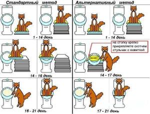Вот где то я нашла схему обучения кота ходить в туалет на унитаз.Думаю,что многим поможет при обучении, главное - терпение.