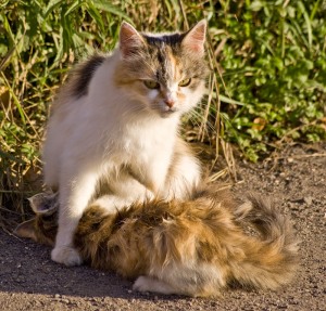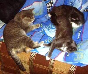 И у брата было двое. Старая кошка жила уже годов семь, когда подобрали из жалости кастрированногоо выгнанного кота соседей. Сначала Леди его третировала, но потом он как-то обжился и стал любимцем. Смешно было смотреть, как они однажды двое (огромные котища по пять-шесть кг каждый) в едином порыве любви к маме, прилёгшей на диван, обое взгромоздились ей на грудь и поуркивали и шипели друг на дружку, и толкались боками, но никто не уступал
