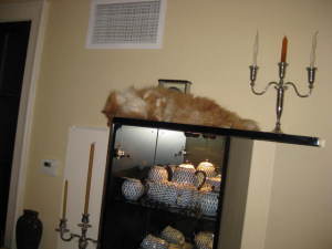 Лаура Ли, моя младшая осваивает верхи уже два месяца. Последние два дня спит на балконной двери, сегодня ночевала на холодильнике, в понедельник свалилась с кульмана (у меня сверковь инженер-конструктор). А кот спасть уходит за окно на виноградную лозу. У него там уже восьмой год личные апартаменты.