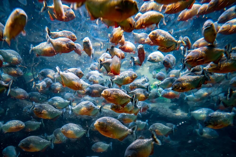 Огромными стаями они нападают на любую добычу, вырывая куски мяса из тела жертвы, они способны за минуту очистить до скелета крупное животное. Этих рыб привлекают всплески воды и запах крови. Кормящиеся пираньи — неприятное зрелище. Вода буквально вскипает от снующих туда-сюда рыб. А жертва, окруженная этими хищницами, буквально исчезает на глазах.
