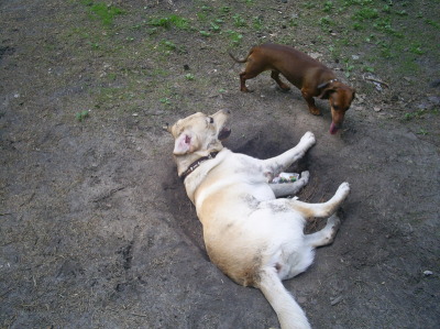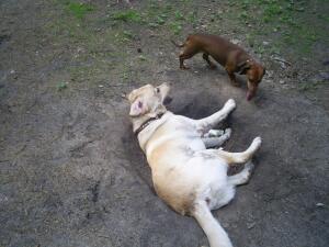 А с Лабрадором на перегонки бегали, пока Такса его не забегала, Лабрадор на виражах пару раз в сосну Башкой попал, вот в Ямку и упал...