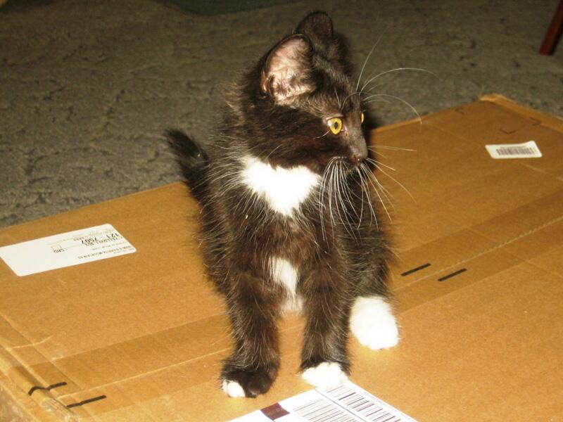 Мы отправились в «кошачий детский сад». Мой муж сразу узнал своего котенка, которого он выбрал по фотографии. Черный котик, с белой манишкой и белыми носочками. Он стоял на задних лапках, жалобно мяукал, как бы прося: «Заберите меня отсюда! Я очень хороший, видите?» Служитель открыл дверцу «квартиры», муж взял котенка на руки, и тот в благодарность ободрал ему руку до крови. Таким образом кот заявил свои права на нового хозяина, и было решено, что одного питомца мы уже выбрали.