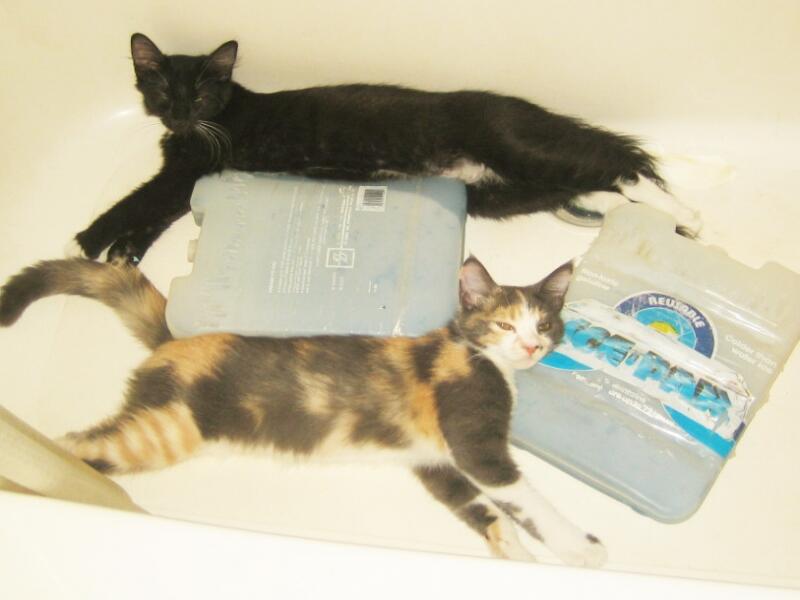 Чтобы создать им больший комфорт, я положила на дно ванны замороженные пластиковые контейнеры. Позднее я стала наливать немного воды в ванну, и в сочетании с замороженными контейнерами прохлады котам хватало на целый день. Постепенно они превратились в «русалок».