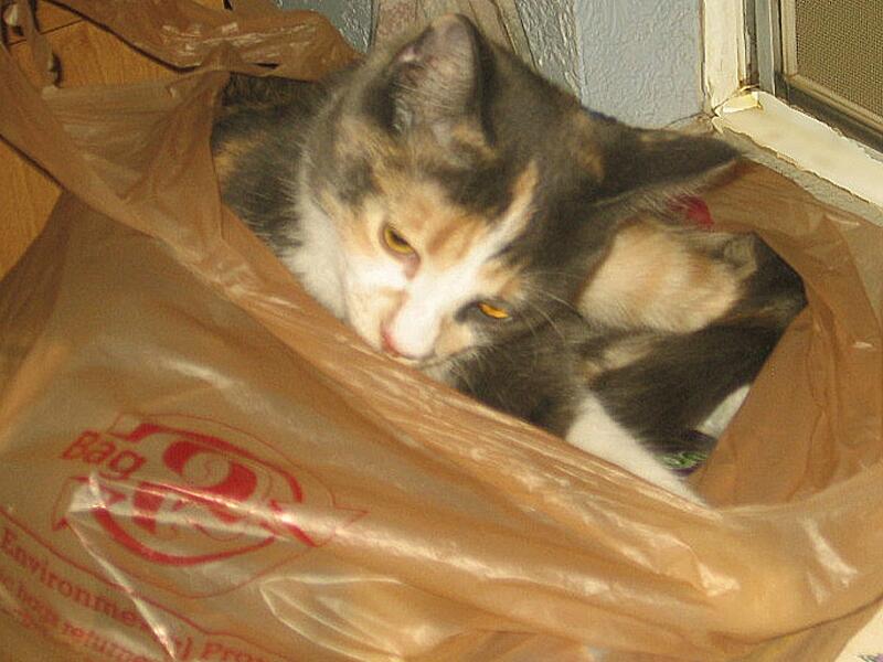 Была уверена, что у меня есть фото нашей трехцветной Сони, которая любила залезать в пакеты, ан нет, оказалось, единственный раз Зайка попробовала, каково это, тут я ее и сфотографировала: