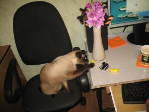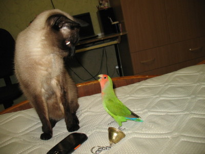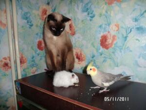 А вот мой Маркиз котик,кстате не орет противно,как многие сиамские,а только по делу издает мяууу и никогда не мешает,если по телефону говорю,а вот мой неразлучник-попик,вот тот любитель поговорить