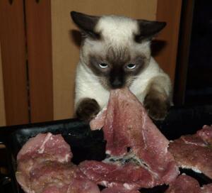 Мой больше травку любит,сырое мясо вообще не ест,тем более свинину...Мой конфеты тырить со стола любит и гонять ими по полу