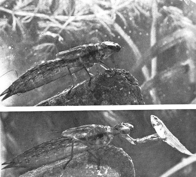 Из яйца вылупляется личинка, похожая на папу с мамой разве только большими глазами да хищническими замашками. Для охоты у личинки имеется внушительная челюсть с коготками на концах, способная далеко выдвигаться и хватать всякую водную живность — других личинок, червей, головастиков, мелких рыбок, а при недостатке оных — и своих братьев.