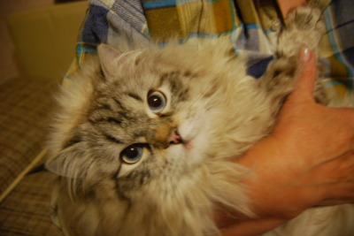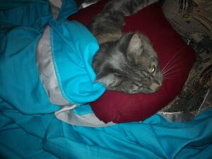 В "благодарность" Кнопище меня сейчас грызёт за руки и ноги, любит только мужа, а недавно, избрав его своим котом и мяукая ему по ночам, решила выжить меня из дома, как самку. Обписяла мои сумки, джинсы на кресле и подушку -- видимо запах перебивала своим. Сволота однозначно!