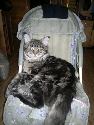 Альф Минор, когда спать ложимся, приходит мне под бок. С пол часика поваляется и уходит спать на лестницу (дом частный). Видимо, там ему комфортней. А днём в обувной коробке от сапог дрыхнет или детской коляске. Я смеюсь, говорю мужу, что приобрёл кота за такую сумму(!!!), а он в картонной коробке спит. Так забавно. Еле умещается!