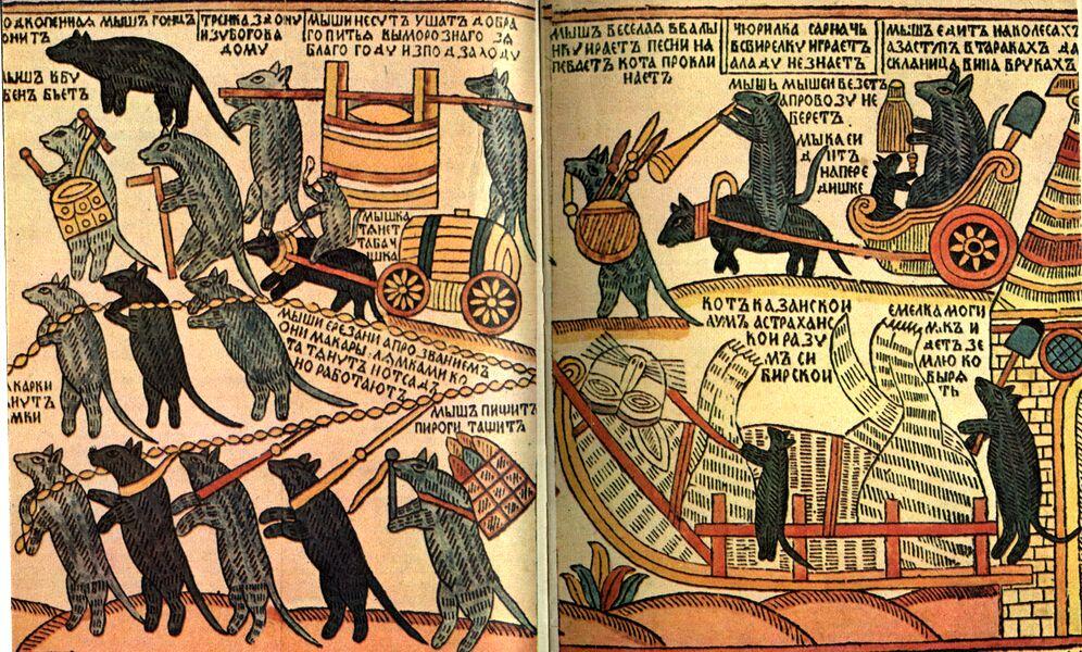 Ещё в древнеиндийском эпосе «Махабхарата» можно встретить историю о кошке, которая притворилась набожной аскеткой и тихонько съедала приходящих к ней паломников. Похожие истории можно встретить в баснях Эзопа, где кошка обманывает своих жертв, прикидываясь то лекарем, то трупом. Последний сюжет нашёл своё отображение в популярном русском лубке «Как мыши кота хоронили» (стоит ли говорить, что праздничные похороны «тирана» закончились для мышей плачевно?).