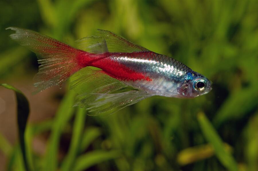 От глаз и до середины ярко-красного хвоста ее тело, в буквальном смысле слова, светится неоновым свечением зеленовато-голубого цвета. Как вы уже догадались — это неончик (по латыни — Paracheirodon), относится он к отряду карпообразных рыб.