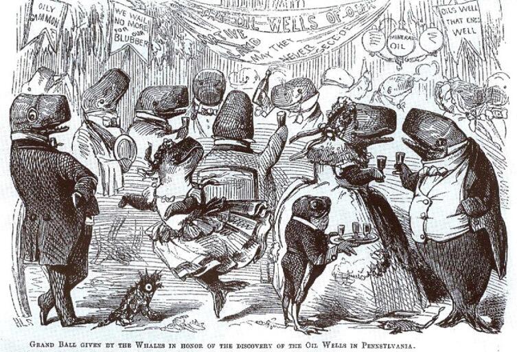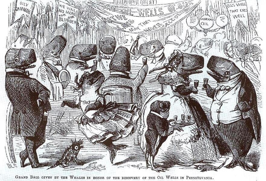 Ниже можно увидеть карикатуру 1861 года, изображающую кашалотов, которые веселятся по случаю открытия новых нефтяных скважин в Пенсильвании.