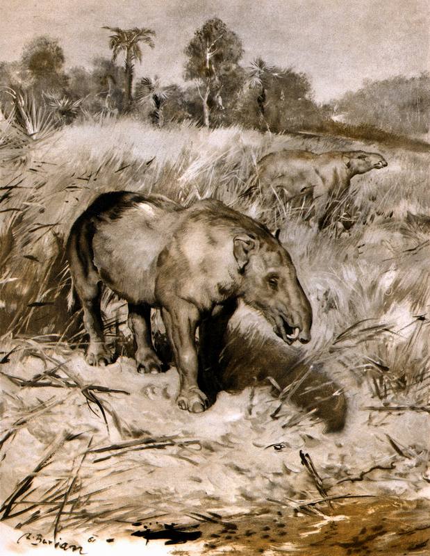 Одним из самых необычных хоботных был живший в эпохи миоцена и плиоцена динотерий («ужасный зверь»). Выглядел он вполне по-слоновьему, а из «ужасного» в его облике были только размеры (до 4,5 м в высоту) и замечательные бивни. Росли они почему-то только на нижней челюсти и торчали не вперёд, а вниз — почти под прямым углом. Зачем динотерию такие «грабли», учёные до сих пор толком не знают.