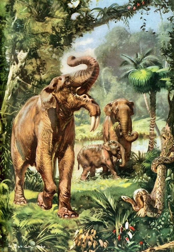 В это же время по суше бродили мастодонты, уже напоминающие своим обликом привычных слонов. Они имели массивный, сильно вытянутый череп, внушительный хобот и выдающиеся вперёд бивни, которые сохранялись и на нижней челюсти (правда, там они были поменьше).