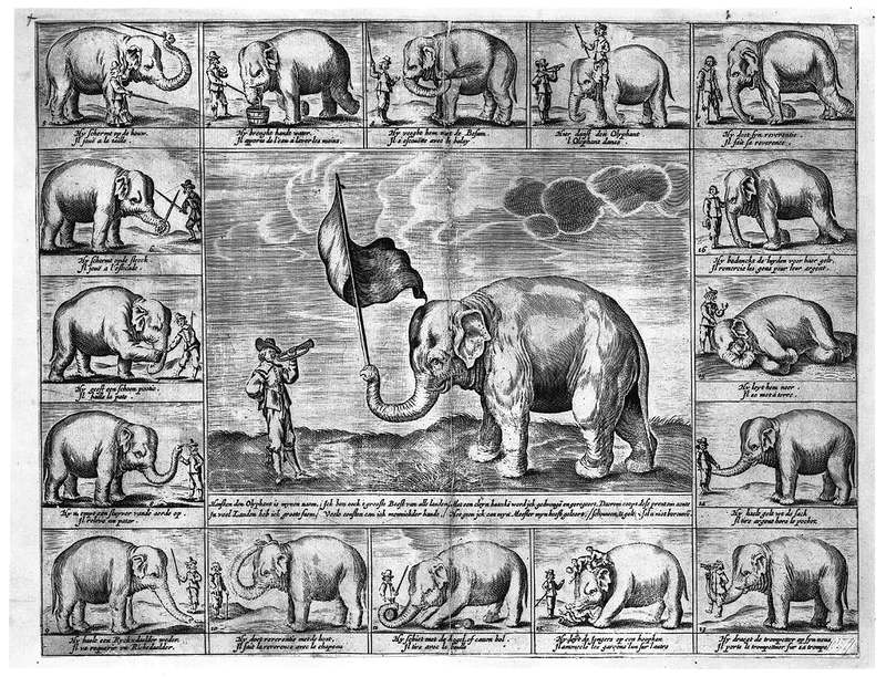 Ну, а «слоновьей звездой» XVII века стала дрессированная слониха по имени Ханскен, гастролировавшая по разным европейским городам. На своих представлениях она становилась на задние ноги, махала флагом, била в барабан, надевала шляпу, доставала деньги из чужих карманов и стреляла из пистолета. Её образ остался запечатлённым на эскизах таких художников, как Рембрандт и Стефано делла Белла.