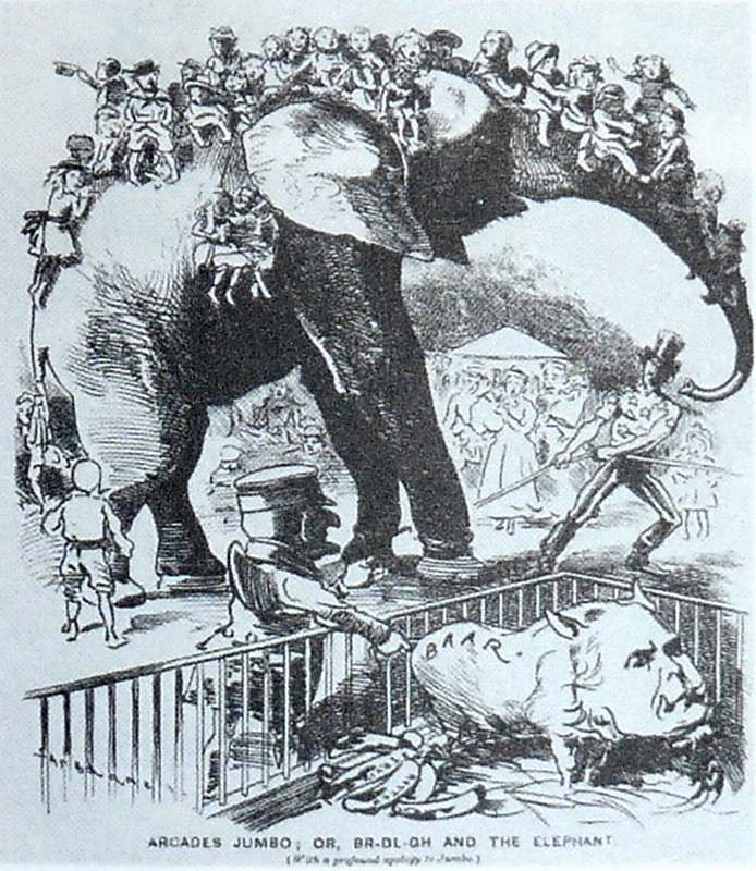Когда в 1882 году Джамбо решили продать американскому цирку «Barnum & Bailey» за 2 тыс. фунтов стерлингов, в обществе поднялась настоящая волна возмущения. Сатирический журнал «Панч» даже опубликовал карикатуру, где предлагалось отправить в США вместо Джамбо депутата Чарльза Брэдлоу (Брэдлоу, как атеист, отказался упоминать в парламентской присяге Бога, чем вызвал скандал).