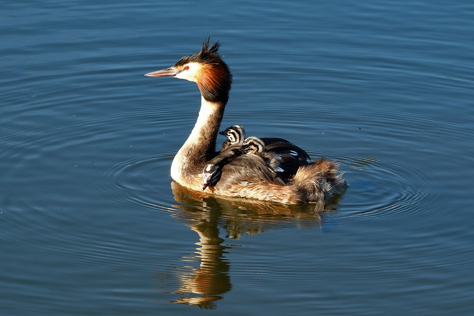 Издали чомгу можно принять за утку, но её выдают «рожки» из перьев, украшающие крупную голову на длинной тонкой шее. И конечно, манера поведения.