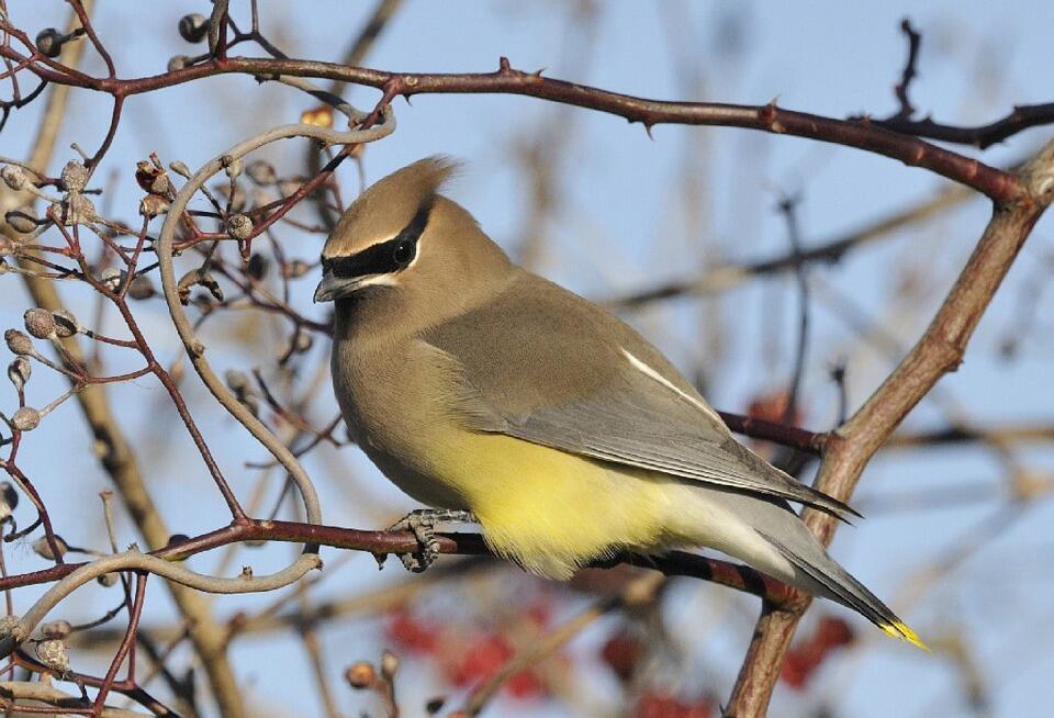Зимние гости прилетают стаями. Вот и свиристелей если повезёт встретить, то всегда сразу много. Птицы они крупные, активные, заметные — мимо не пройдёшь. Мы безошибочно узнаём свиристеля по хохолку и яркой окраске: дымчатый, розово-серый фон расцвечен чёрным, белым, жёлтым и красным. Нарядные, как ёлочные игрушки, энергичные и шумные — ничего общего со снегириной задумчивостью. Птицы эти большие обжоры. Стая свиристелей, кормящаяся на рябине, подпускает к себе достаточно близко, чтобы можно было полюбоваться этим великолепным зрелищем.