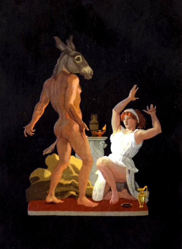 «…на меня напал немалый страх при мысли, каким образом с такими огромными и грубыми ножищами я могу взобраться на нежную матрону, как заключу своими копытами в объятия столь белоснежное и хрупкое тело, сотворенное как бы из молока и меда, как маленькие губки, розовеющие душистой росой, буду целовать я огромным ртом и безобразными, как камни, зубами и, наконец, каким манером женщина, как бы ни сжигало до мозга костей ее любострастие, может принять детородный орган таких размеров».
