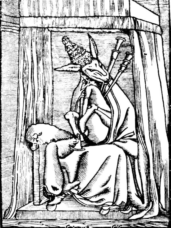 Например, в «Романе о Лисе» (XII−XIII вв.), где представители разных слоёв общества выступают под масками животных, глупый осёл Бодуэн играет роль придворного проповедника. Не щадили даже Римского папу, особенно в разгар Реформации. На одной из карикатур XVI века можно увидеть осла в папской тиаре, который играет на волынке (так художник хотел показать, что под дудку папы пляшут европейские правители).