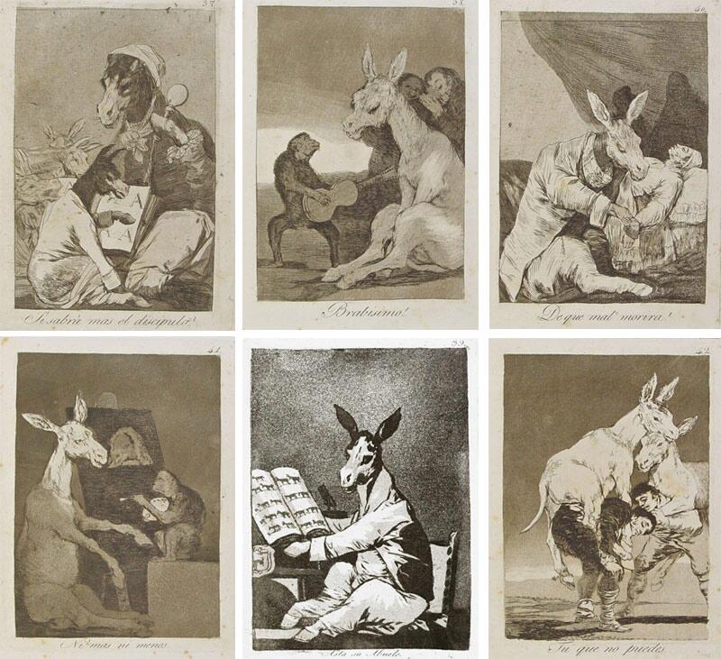 Это далеко не единственные ослы, которые присутствуют на серии сатирических гравюр Гойи, известных под названием «Капричос» (1799). Здесь и слушатель, восхищающийся игрой обезьяны на гитаре («Брависсимо!»), и самодовольный врач-шарлатан («От какой болезни он умрет?»), и напыщенный позёр, которому пишут заказной портрет, скрывая ослиные черты под благородным париком («Точь-в-точь»), и осёл, гордящийся своим древним генеалогическим древом («Вплоть до третьего поколения»). Но самую жестокую гравюру — «Ты, которому невмоготу» — Гойя посвятил социальной несправедливости, изобразив ослов, которые… оседлали людей.