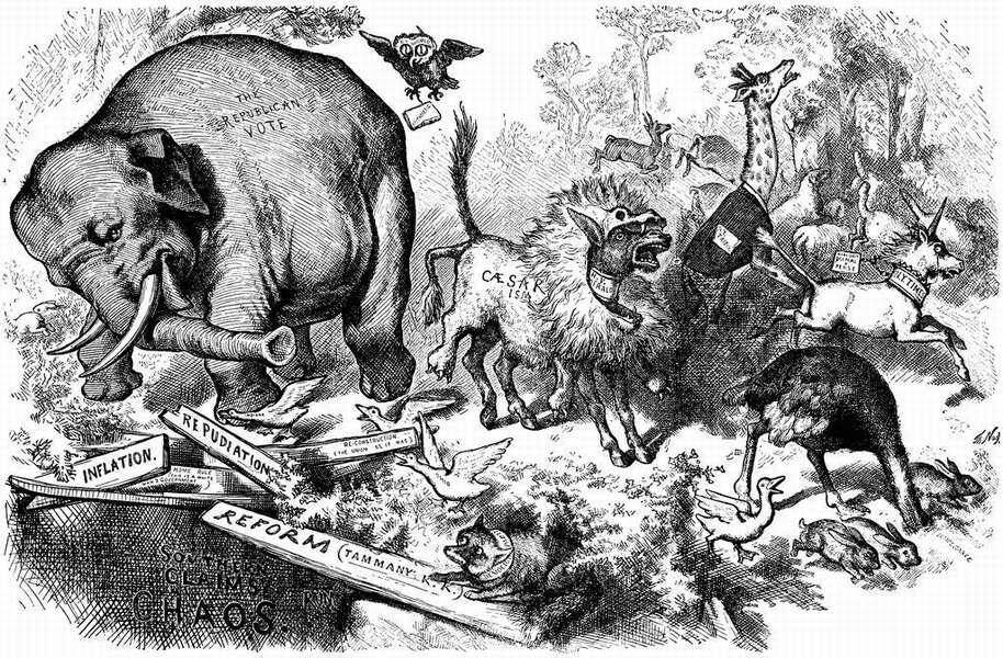 Однако после серии похожих карикатур эти животные аллегории настолько закрепились в массовом сознании американцев, что партиям пришлось в итоге принять их в качестве своей символики. Причём демократы снова придумали хитрую «отмазку»: мол, они, подобно Валаамовой ослице, предупреждают народ об опасностях.