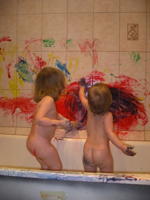 А ещё некоторые родители, давая малышам краски, оставляют их голенькими, чтобы одежда не пострадала, а занимаются этим обычно в ванной. Очень прикольно ^_^