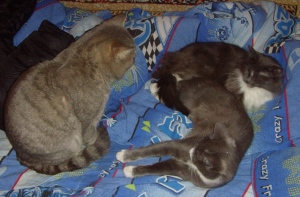 Когда груз полностью был доставлен «на землю», умные кошки его «заховали». Хитрюги! К моменту появления растревоженных хозяев коридор был пуст. Зато когда они улеглись снова… началось! Милка и Пушок азартно «регбились» в паре, и каждый представлял собой отдельную команду: как только один игрок, перекатывая между лап шарик, увлекаясь, превышал мощь подачи, и тот улетал далеко (как правило, грохаясь о стену), второй вылетал наперерез и «гасил», продолжая вести в собственных интересах.