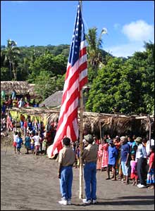 Я покопала эту тему. Оказывается дело-то уходит еще во времена Георга 5-го. Его на острвах почитали за Иегову. Раскопала про культ Джона Фрума. Его почитали за короля США. Этих культов, оказывается, до 70 видов. Основаны на основном фундаментальном иудохристианском постулате - приход месии-Мошиаха. А на Тану они отметили уже 50 лет своего культа. Каждый год у них парады с поднятием флогов, Ребята все одеты в форму США, с деревянными ружьями шагают по ВПП и призываю к прилету мессий в форме. Что интересно - в глухой деревне в Перу в 1971 г. после отъезда группы киношников местные индейуы из дерева поастроили себе кинооборудование и поимели культ ритуальной киносъемки. Снимают кино по сей день деревяшками. Очень забавные фото выковыряла: культ поднятия флага