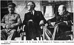 Наверное, чтобы отдать дань уважения Рузвельту, не дожившему до дня Победы, на первой полосе поместили фотографию, сделанную на Тегеранской конференции в 1943 году. Обратите внимание, как удачно фотограф поймал момент — Рузвельт и Черчилль сидят, повернувшись в сторону Сталина.