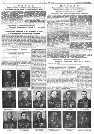 На второй странице газета разместила два приказа Верховного Главнокомандующего. Один — о том, что 9 мая в 4 часа утра освобождена столица Чехословакии Прага. Второй — победный, в котором отмечается, что «Великая Отечественная война, которую вел советский народ против немецко-фашистских захватчиков, победоносно завершена, Германия полностью разгромлена».