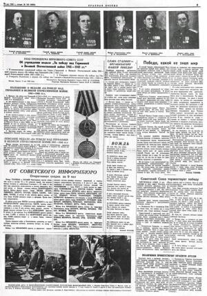 Третью страницу открывают фотографии главных маршалов и маршалов родов войск. Символично, что уже 9 мая был подписан Указ Президиума Верховного Совета СССР «Об учреждении медали «За победу над Германией в Великой Отечественной войне 1941−1945 гг.», который публикует газета.