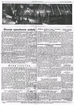 Несомненный интерес вызывает статья «Москва празднует победу». В ней много любопытных деталей: это и описание того, как люди, взявшись за руки, единым потоком двигались по улицам; как разгоряченная молодежь почти час качала Героя Советского Союза Павла Бублия, прибывшего в столицу лишь накануне; как центральные площади столицы превратились в одну гигантскую эстраду, на которой выступали сотни артистов; как напротив американского посольства собравшиеся провозглашали здравицы в честь союзников, а с балкона посольства отвечали здравицами в честь Красной Армии и Маршала Сталина.