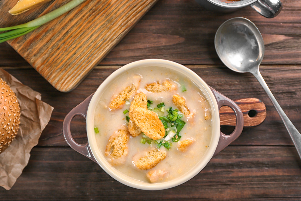 В традиционных рецептах холодной похлебки (тюри) обычный хлеб крошится в жидкость. Можно в суп нарвать армянского лаваша. А французы в свои супы закладывают гренки.