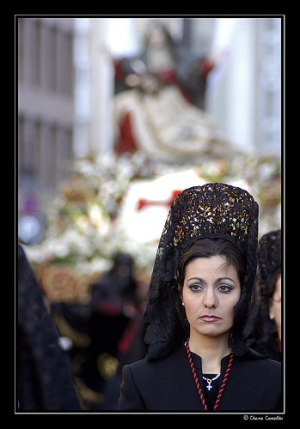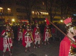 Главное же шествие начинается вечером, около 9 часов. О том, что процессия вышла из храма, вы услышите по звукам армейского горна римских легионеров. Они открывают процессию. За ними идут братства, каждое со своим «троном» — фигурами Христа, Божьей Матери и сценами из Скорбного Пути. Впереди каждого братства идут дамы в чёрном, с веерами, в традиционных мантильях с высокими гребнями. Они сопровождают несущих штандарты братства. За ним — дети со свечами и далее — члены братства, одетые в капюшоны: плащи с остроконечными колпаками и прорезями для глаз и для рта. Они несут «трон» — реликвию братства, пышно украшенную золотом и серебром, вышивками и живыми цветами. Каждое братство сопровождает оркестр, это может быть хор или настоящий камерный оркестр, духовой или состоящий только из барабанщиков. Торжественное, пышное, скорбное и впечатляющее шествие.
