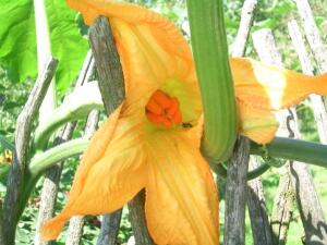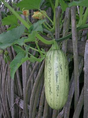 Тыква выросла из этого цветочка, так и висела на заборе, пока конь не отъел половину.