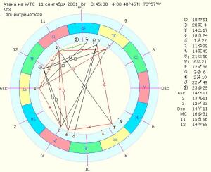 Это гороскоп атаки на первую башню Торгового Центра." Как и у минобороны Асц во второй декаде Весов. Бросается в глаза управитель Близнецов Меркурий на Асц карты - он чётко символизирует две разрушенные близнецы-башни. Асцендент карты указывает на характер события в целом - воздушное пространство Весов и вездесущий, двойственный по природе Меркурий вполне подходят к теме угона самолётов и теракта с воздуха. Идея теракта исходит из "родительского" дома события, это 4й дом. Его хозяин Сатурн расположился в Близнецах в 9 доме, указывая на зарубежные корни идейного вдохновителя, хотя он может проживать и в США - о связи знака Близнецов и США забывать нельзя.. Его внешность такова: "человек высокого роста, с овальным тёмным лицом, тёмный шатен или брюнет, извращён, но не утончён, упрям и часто невезуч" (по В.Лилли). Расходящаяся в 2 градуса оппозиция Сатурн-Плутон может указывать, что этот человек испытал серьёзный жизненный кризис за пару месяцев или недель до события. Если отойти от персональных характеристик и попытаться взглянуть на причину, родившую теракт, шире, то её можно описать как "древнее, жесткое, подчинённое многим ограничениям, предписаниям и обычаям мировоззрение, в котором нет места чувствам, где всё основано на голом расчёте и рациональности" (Сатурн в 9, Близнецы). Второй управитель 4-го, ретроУран (система управления С.А.Вронского) находится в 5 доме, в Водолее указывает на талантливый изобретательский коллектив преступников. Любопытно, что альмутеном этой карты является Венера во Льве в 11 доме. Возьмусь назвать это событие просто - ПОКАЗ, при этом цели события указываются Луной в 9 доме, хозяйкой МС, которая имеет связь с формированием нужного мировоззрения и не только внутри США (Близнецы), вполне допустимо рассматривать этот 9-й дом как "весь мир"."
