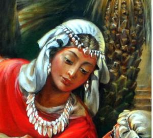 Она необычайно красива — Элиэзер не может отвести от нее взор. Ее лицо напоминает полную луну (луноликая). Бусы из перламутра — символ ее невинности: