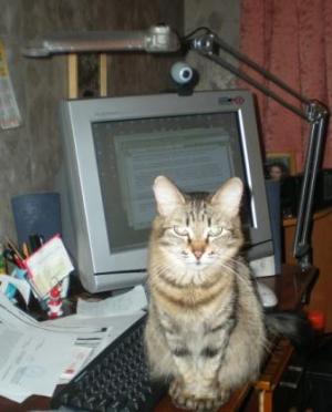 Кошка Муряша в нашем доме любимица. Мужа обожает, меня терпит, дочерей слегла выносит. Любит сидеть у меня под носом у компьютера на клавиатуре - не сдвинуть. Приходится изощряться, что бы печатать. Сколько хватает терпения - потом просто беру на руки и выношу в другую комнату, закрыв дверь.