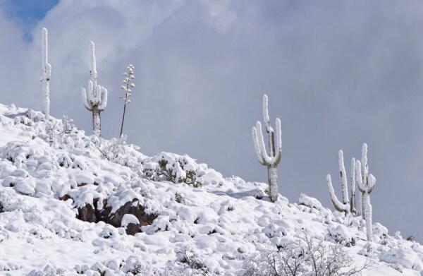 Такую картину можно увидеть в Аризоне один раз в 20 лет: сагуаро кактусы под снегом!