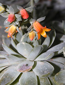 Главный отличительный признак эхеверий — их цветки, похожие на маленькие колокольчики, по которым легко можно отличить эти растения от очень похожих на них эониумов, дудлей, граптопеталумов. Цветки у эхеверий в зависимости от вида бывают длиной от 1 до 3 см, располагаются на боковых соцветиях. Длина соцветия может быть от 4 до 50 см в длину, оно может заканчиваться даже небольшой розеткой листьев. Мясистые чашелистики покрыты восковым налетом или опушены, как и листья. Цветки-колокольчики бывают от желто-зеленой до красновато-оранжевой окраски, более яркие с внешней стороны. Если происходит перекрестное опыление, то эхеверии завязывают плоды — пятигнездные коробочки с мелкими коричневыми семенами.