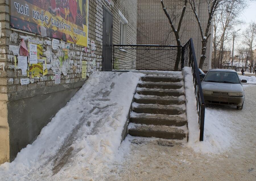 Вот пример современной "заботы" об инвалидах. Среда, как вы понимаете, должна быть безбарьерная, входы в магазины и офисы - оборудованы пандусами социальн. назначения. То, что слева от ступенек - это то самое, что должно бы инвалидам обеспечить комфортное существование. Кто однажды, хотя б ради опыта, садился в инв. коляску - наверняка оценит "заботу". Отмечу лишь: на этот "пандус" с крыши течет вода - естественно, зимой "пандус" еще и льдом покрыт.