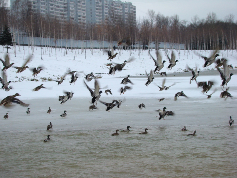 Если в городской черте есть незамерзающие водоемы, то на них, как правило, остаются зимовать стаи диких уток. С их кормлением есть определенные трудности: брошенные в воду зерно или куриный комбикорм тонут, их нужно сыпать на лед, если нет специальных кормушек, немного погруженных в воду. Чаще всего так и бывает — кормушек нет, поэтому основным кормом становится белый хлеб или нежареные семечки — эти корма в воде не тонут и с удовольствием поедаются утками на радость всем кормящим.