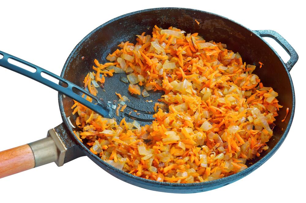 Приглядывайте за процессом, а где-нибудь через полчаса готовьтесь еще немного потрудиться. Роняя слезу, режем мелко луковицу и натираем на мелкой терке морковину (у меня были только недоросли, поэтому я истер две штуки). Достаем сковороду и на масле и несильном огне готовим заправку. Лук — до стекловидности, морковь — до мягкости. Поскольку луку все равно до стекла далеко, полагайтесь только на себя.