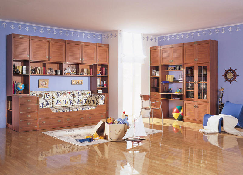 Конечно, детские комнаты должна быть просторными, а это означает минимум мебели. Как правило, для детской достаточно кровати, стола и тумбочки. Если в комнате живут несколько детей, то лучше всего отдать предпочтение двухъярусной кровати, оставив каждому ребенку свой стол и шкафчик. Это даст возможность детям не только обзавестись личным пространством, но и приучит их к порядку и ответственности за свои вещи. Кроме того, просторную комнату легче убирать, а сами дети смогут играть в ней не только в настольные, но и сравнительно подвижные игры. По желанию в комнату детей кроме столов и кроватей могут быть установлены «тренажерные стенки», которые помогут и мальчикам, и девочкам развиваться физически.