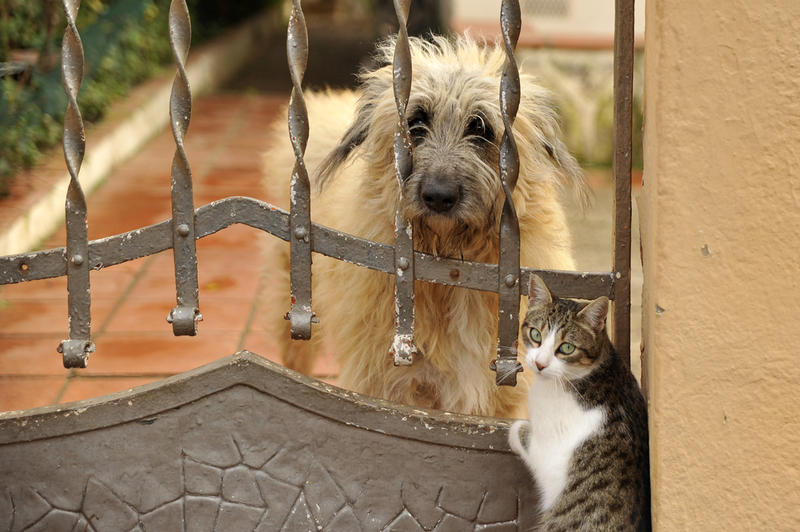 Однажды видел такую сценку на улице: собака на задних лапах стоит у каменного парапета, а кошка, сидящая на парапете, лижет ему голову.