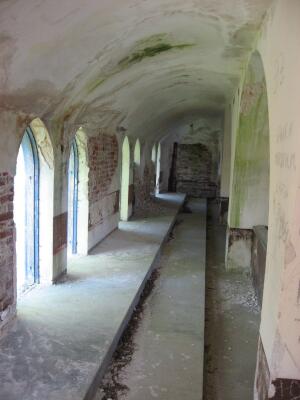 Хоры над одним из узких боковых нефов. Над вторым - точно такие же. Изнутри хоры ограничены барьером и полуциркульными арками, одну из которых и часть барьера хорошо видно в правой части снимка. В левой части фотографии - окна в продольной (наружной)стене кафоликона, которыми освещаются оба боковых нефа (каждый - своими окнами).
