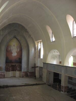 Интерьер кирхи. Справа хорошо видны два больших окна в алтарной части кафоликона (прямо над крестом), освещающие средний неф; барьер и полуциркульные арки хоров над южным боковым нефом. Над арками - свет, падающий из люкарен, за счет которого так же освещается средний неф.