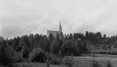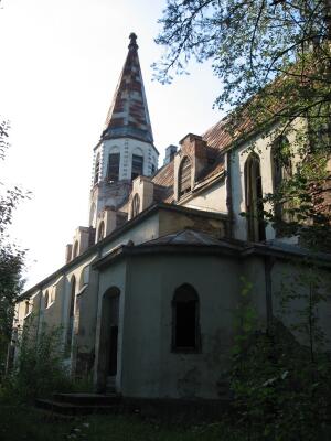 Восточный и часть северного фасадов кирхи. На последнем видны два больших стрельчатых окна алтарной части и часть стены северного входа в неё.
